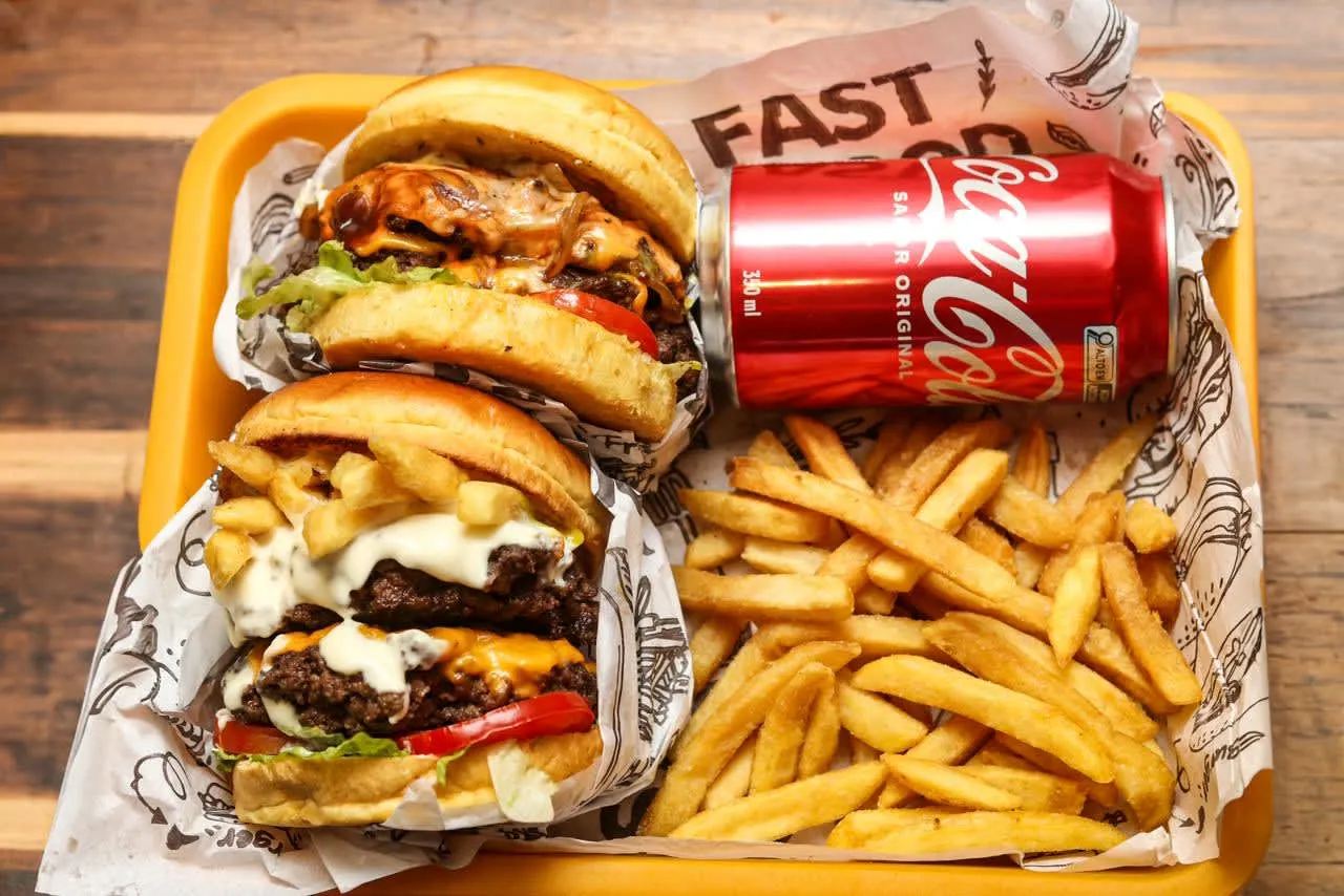 Dinamite: Pão Brioche, 6 carnes suculentas de 100 gramas de hambúrguer, dois queijos e molho especial.+ Porção de Batata Frita + Refrigerante em lata de 350ml