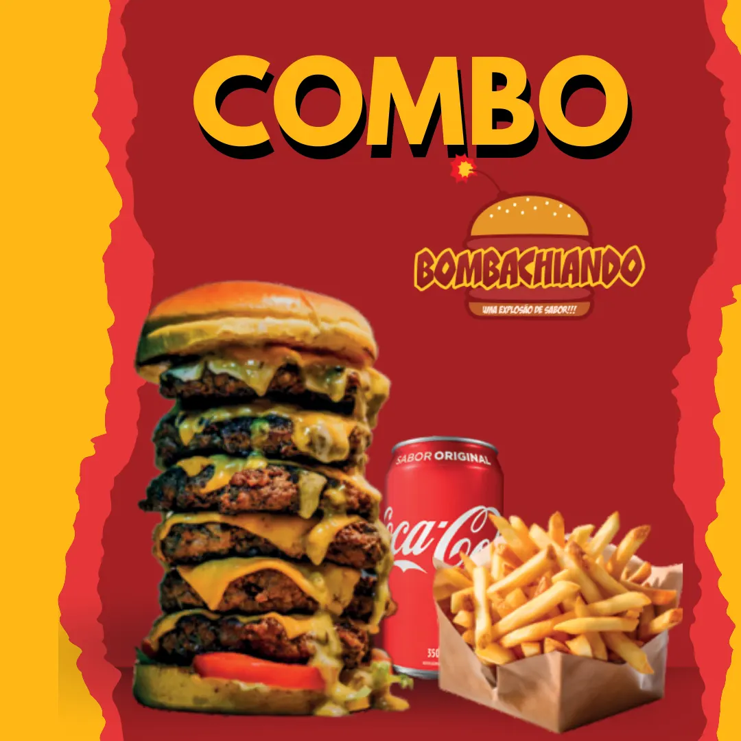 Dinamite: Pão Brioche, 6 carnes suculentas de 100 gramas de hambúrguer, dois queijos e molho especial.+ Porção de Batata Frita + Refrigerante em lata de 350ml