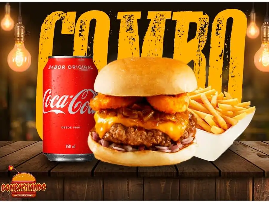 Bomba Cheddar: Pão Brioche, 100 gramas de carne suculenta de hambúrguer, queijo cheddar derretido e cebola caramelizada no shoyo.+ Porção de Batata Frita + Refrigerante em lata de 350ml