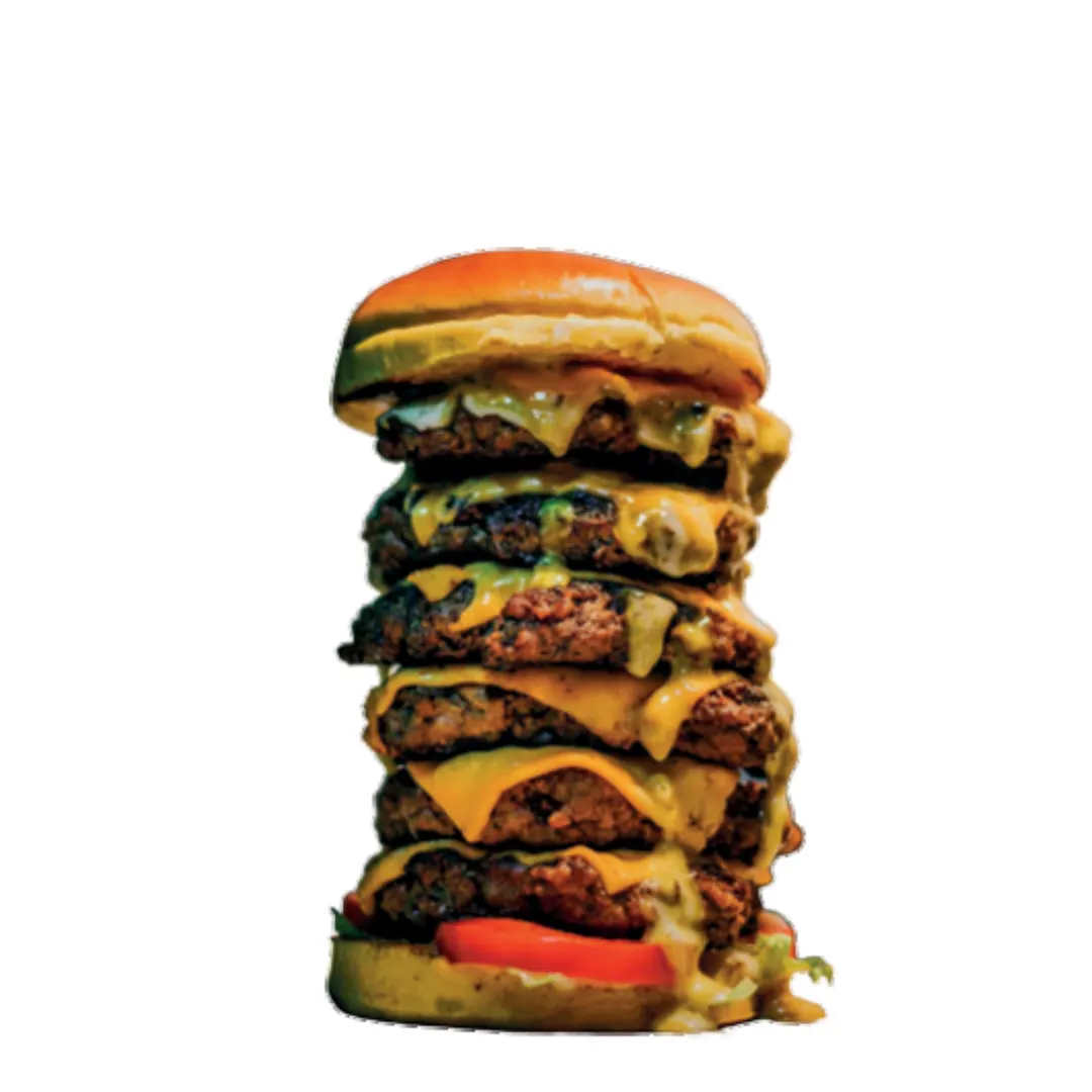 Pão brioche, 6 carnes de 100gr 6 queijos derretido6, molho especial e salada.