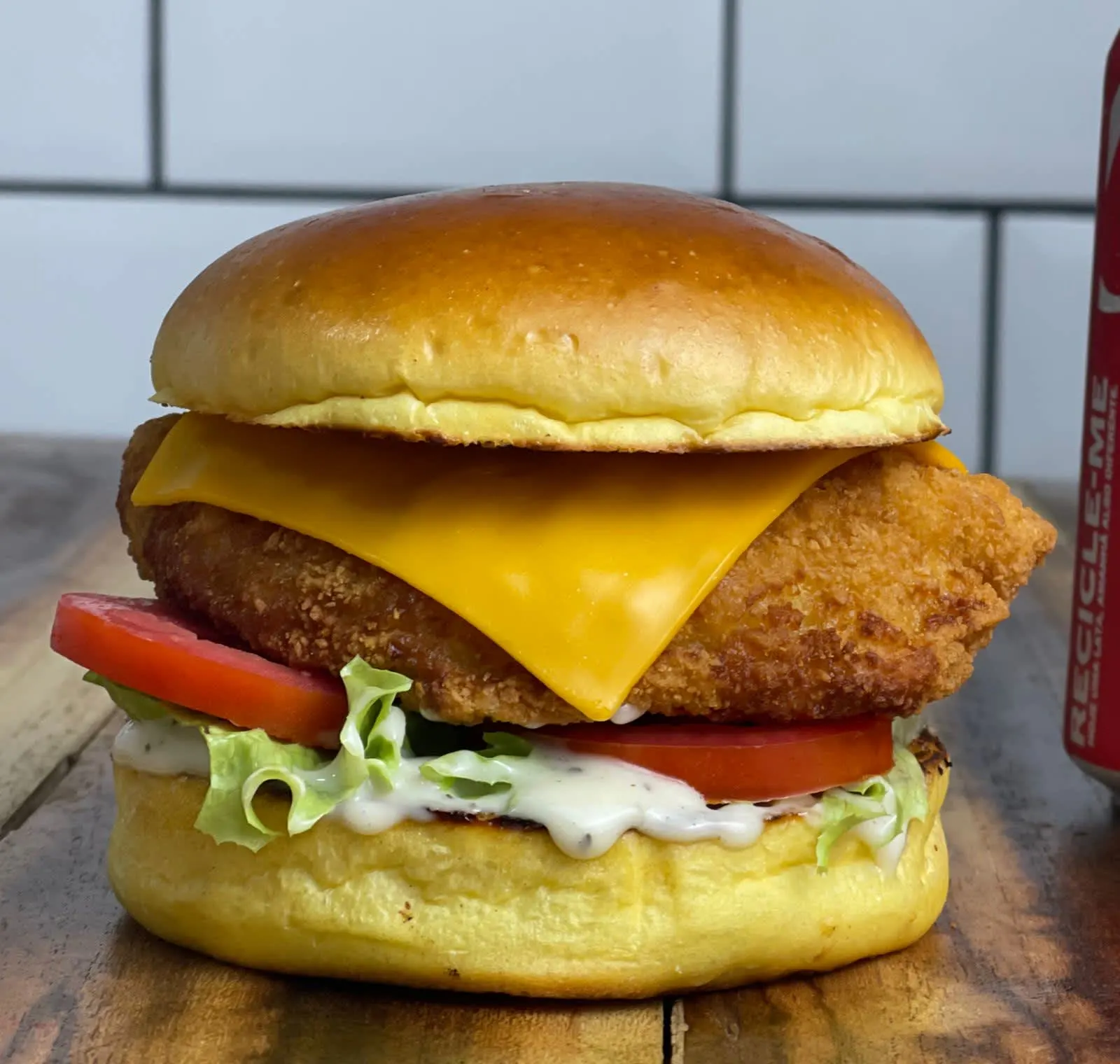 Pão brioche, frango temperado empanado, queijo cheddar derretido, molho especial e salada.