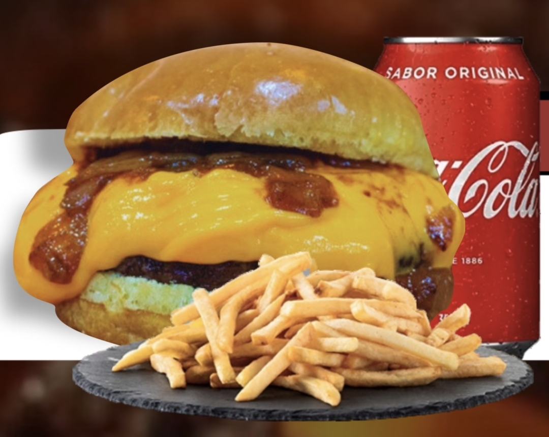 HAMBURGUER FEITO NA BRASA + BATATA E REFRI PÃO BRIOCHE, 1 HAMBÚRGUER DE 150 G (CARNE ARTESANAL), QUEIJO CHEDDAR CREMOSO, CEBOLA CARAMELIZADA, TOMATE, ALFACE E MOLHO ESPECIAL DA CASA.