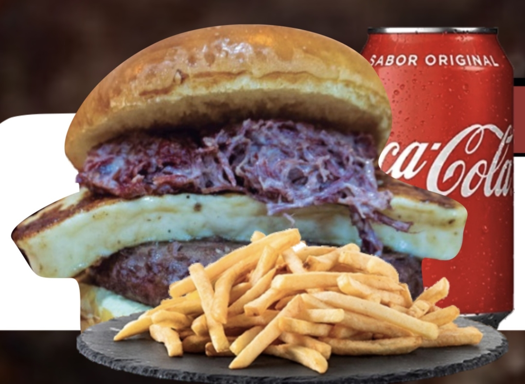 HAMBUREGUE FEITO NA BRASA + BATATA P E REFRI 350ML PÃO BRIOCHE, 1 HAMBÚRGUER DE 150 G (CARNE ARTESANAL), QUEIJO COALHO, CHARQUE DESFIADA, CEBOLA CARAMELIZADA, TOMATE, ALFACE E MOLHO ESPECIAL DA CASA.