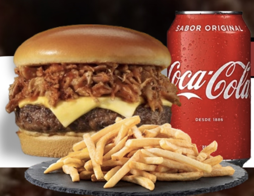 REFRI+ FRITAS P PÃO BRIOCHE, 1 HAMBÚRGUER DE 150 G (CARNE ARTESANAL), 2 FATIAS DE QUEIJO CHEDDAR DERRETIDO, COSTELA DESFIADA E GELEIA DE PIMENTA, TOMATE, ALFACE E MOLHO ESPECIAL DA CASA.