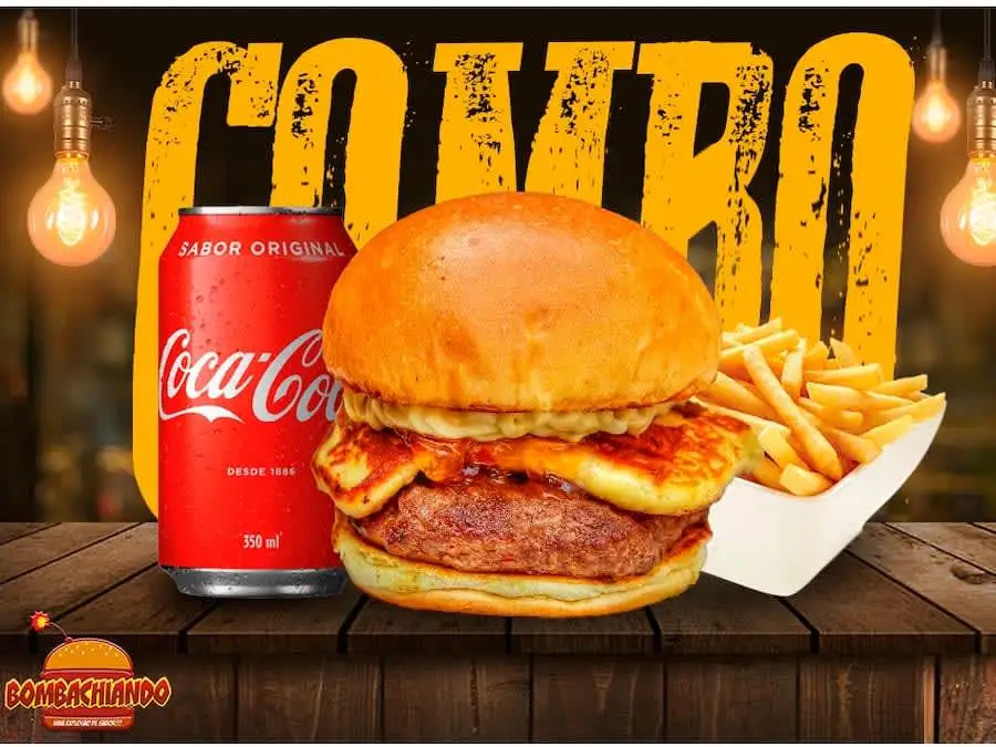 Bomba Burguer: 100g de carne suculenta de hambúrguer bovino, queijo, tomate, alface e molho especial.+ Porção de Batata Frita + Refrigerante em lata de 350ml