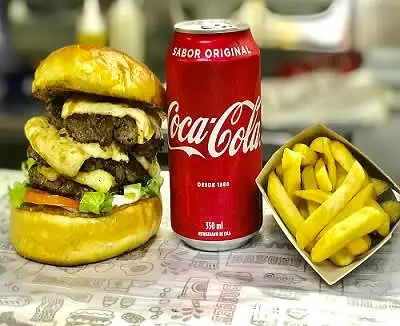 Triplo Coalho: Pão brioche, 3 carnes suculentas de hambúrguer com 100g, queijo coalho, salada e molho especial. + Porção de Batata Frita + Refrigerante em lata de 350ml