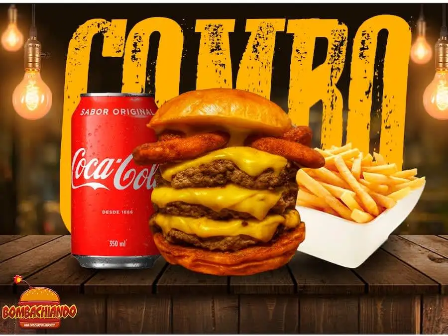 Triplo Onion: Pão brioche, 3 carnes suculentas de hambúrguer com 100g, 3 queijos, anéis de cebola empanado, salada e molho especial. + Porção de Batata Frita + Refrigerante em lata de 350ml