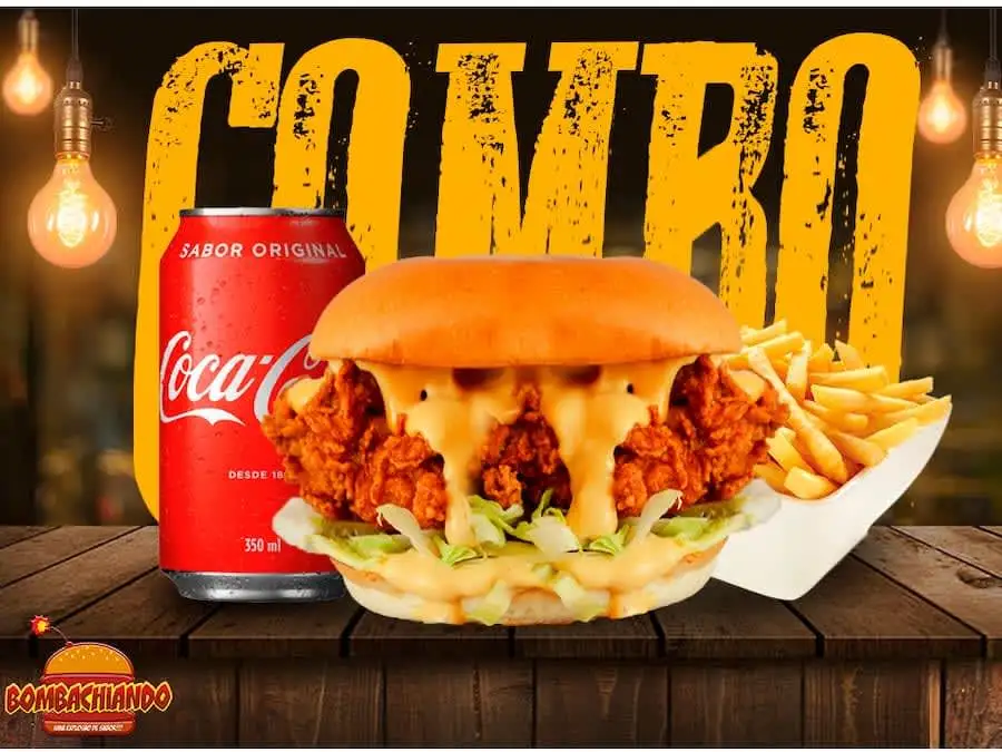 Bomba Chicken: Pão brioche, frango temperado empanado, queijo, molho especial, tomate e alface.+ Porção de Batata Frita + Refrigerante em lata de 350ml