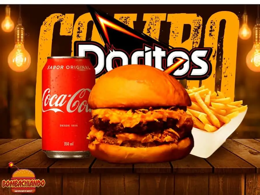 Granada: 100g de carne suculenta de hambúrguer bovino, Doritos, queijo, molho especial e tomate.+ Porção de Batata Frita + Refrigerante em lata de 350ml