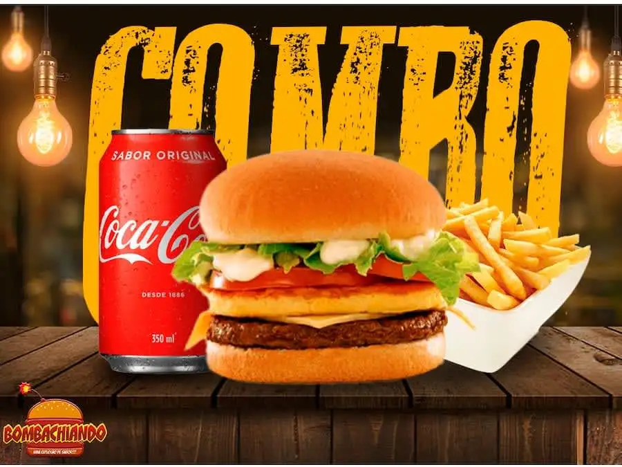 Bomba Burguer: 100g de carne suculenta de hambúrguer bovino, queijo, tomate, alface e molho especial.+ Porção de Batata Frita + Refrigerante em lata de 350ml