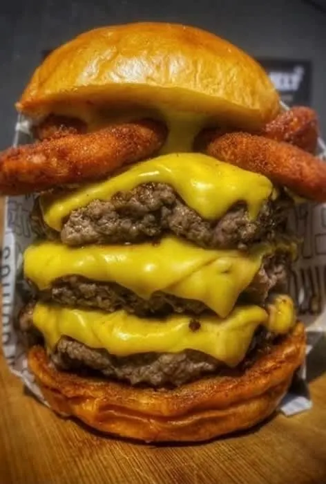 Pão brioche, 3 hambúrgueres de 100g, 2 anéis de cebola empanado, queijo cheddar derretido, molho especial e salada.
